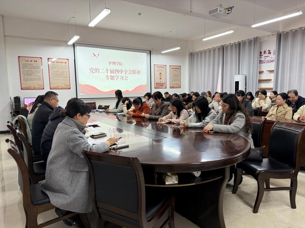 为深入学习贯彻党的二十届四中全会精神,切实将全院师生员工的思想和行动统一到全会精神上来,11月18日,护理学院在和济楼C218组织召开“党的二十届四中全会精神”专题学习会。会议由护理学院党总支书记吴少林主持,全体教职员工参会,师范学院党总支周思昀列席旁听。